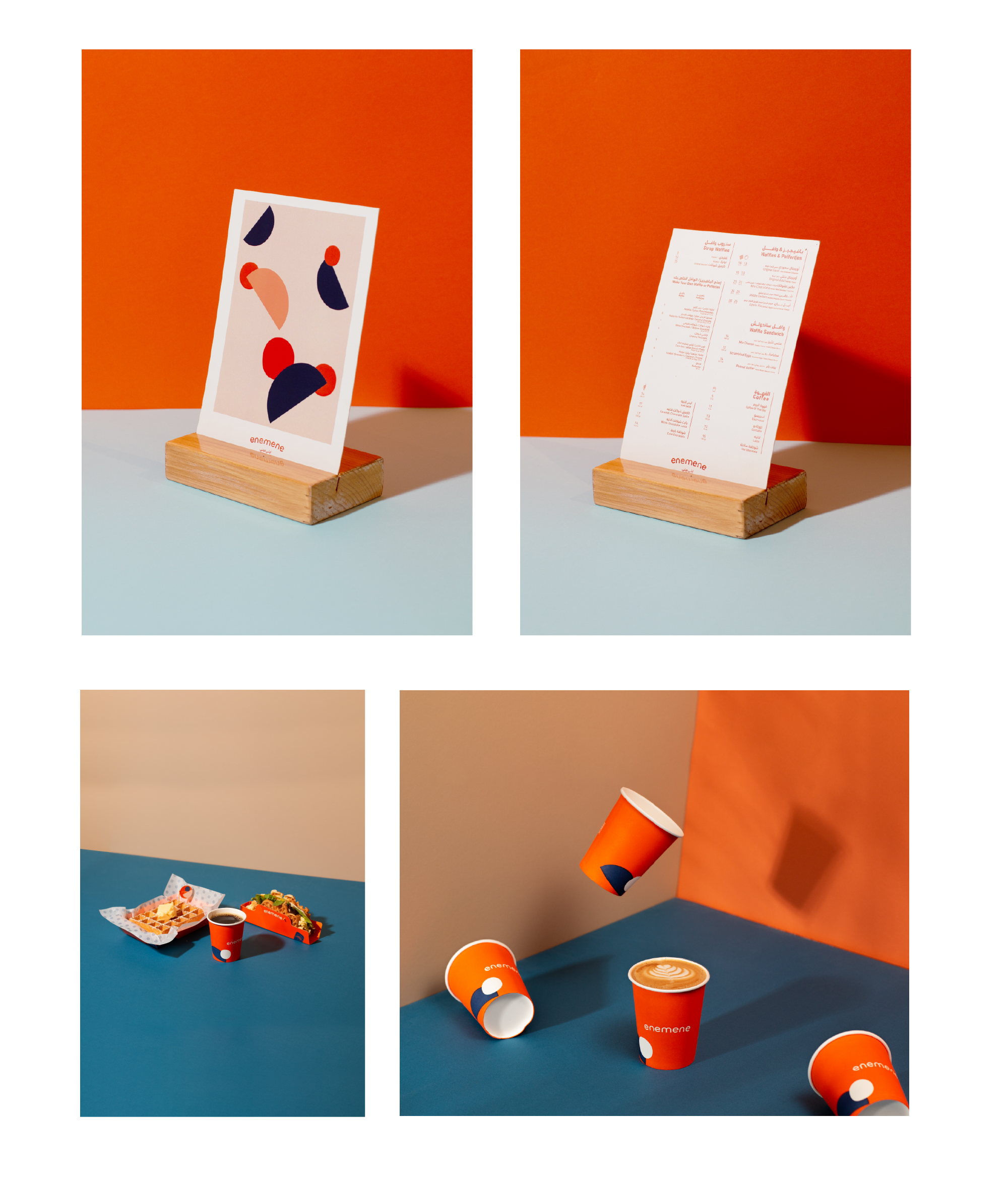 Enemene is a small local business with a fun and vibrant vibe. Started in 2016 as food truck and now the the owners opened their first shop located in Riyadh, Saudi Arabia. It sells a high quality Dutch Goodes made specially for them, such as waffles, poffujerts and coffee. our main role was to create a completely unique Identity for the brand. When I first met with the founder he said he wanted something very fun, colorful and eye-catching, something that will stand out, WITH an artistic touch. I designed a bright and fun, youthful visual identity using 1 main color: orange. And Other colors depending on the concept. Also 3 main shapes Was taken from the products it self. The shape can be use in so many ways ( as shown ) and the idea behind it is to be Creative with it as much as we can. I also illustrated some icons and pattern to use on various shop materials. cups, boxes, stickers and artwork were also a part of the branding experience.